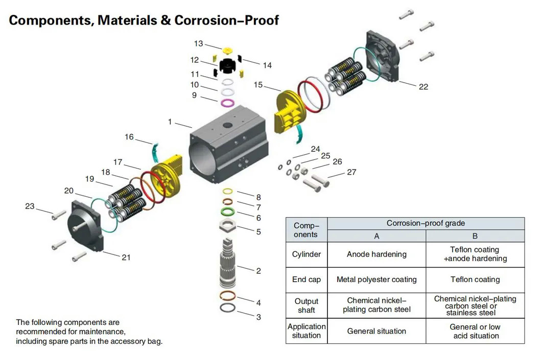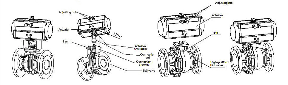 通常、アクチュエータとボールバルブの組み立てはブラケットと接続セットを使用して行われます。あるいは、専用ステムを空圧アクチュエータの軸穴に挿入して組み立てることもできます。主軸先端部がアクチュエータの軸穴からはみ出さないようにしてください。噛み込みによる動作不良の原因となります。すべての接続部品は高い組み立て精度が必要です。開閉角度の変化によりバルブ漏れの原因となります。部品の組み立て公差は関連規格に準拠する必要があります。軸穴(ステム)、角穴、長穴の主軸先端の公差はH11/d11、平行度、対称性は幾何公差9級です。