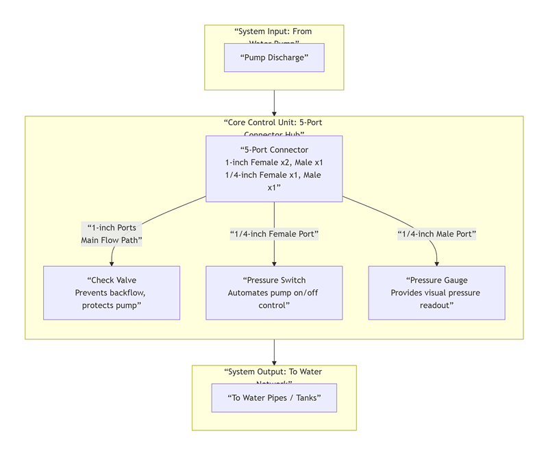 システムにすでに個別の逆止弁が備わっている場合、または逆止弁機能がまったく必要なく、単に信頼性の高い「マニホールド」が必要な場合には、5 ポート コネクタが最も経済的で簡単なオプションです。その価値は、配管レイアウトを簡素化し、個別の継手の数を減らすことにあります。具体的なシナリオには次のようなものがあります。